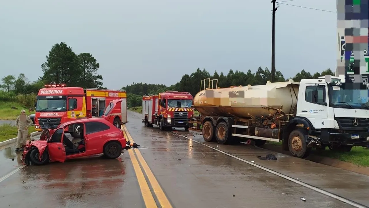 De acordo com o atendimento realizado pelo 14º Batalhão de Bombeiro Militar, a colisão ocorreu quando um GM/Celta atingiu lateralmente um caminhão e, na sequência, colidiu frontalmente contra um segundo veículo de carga. No automóvel estavam duas vítimas.